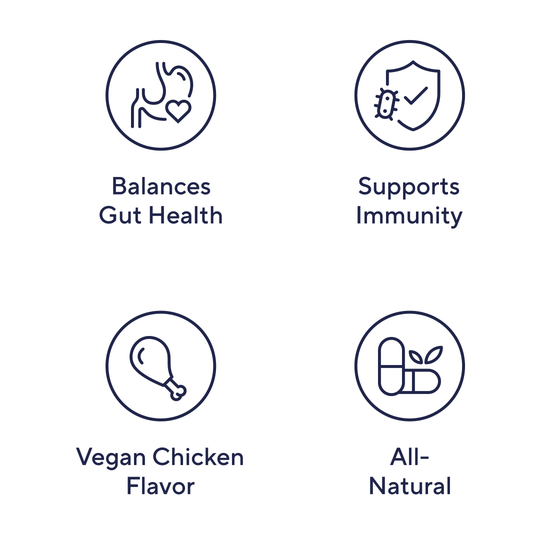 Provide a carefully formulated multivitamin and probiotic designed to deliver everything your dog needs, every day. Simply give them this delicious chicken flavored chew alongside their diet.