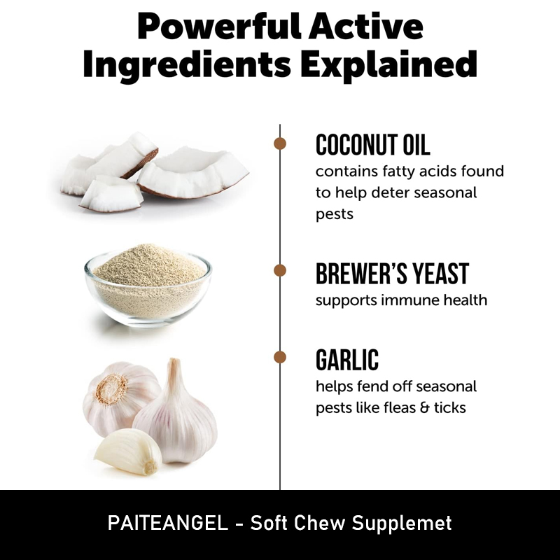 A blend of natural ingredients like garlic, coconut oil, flaxseed and brewers yeast help your dog’s body build up an internal defense against unwanted pests...without chemicals or toxins.